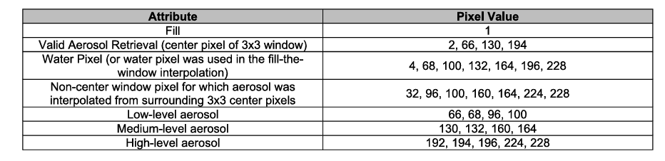 SR_QA_AEROSOL不同像素值对应的含义(十进制数值)如下(尽量避免使用被标记为High-level aerosol的像素)