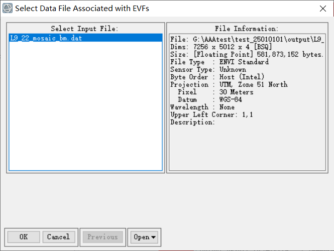 安装好之后,重启ENVI软件。首先通过【File】|【Open】在ENVI中打开矢量边界数据。其中,两幅影像分别为50度带和51度带的坐标系,矢量数据为50度带的坐标系。