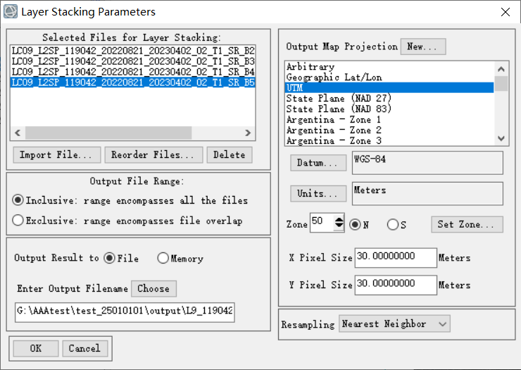 之后对这些导入的波段进行波段合成,方便后续操作。在右侧工具箱中的【Raster Management】|【Layer Stacking】中,选择刚刚导入的波段,然后选择输出路径,文件命名为”L9_119042_220915.dat“,点击【OK】。
