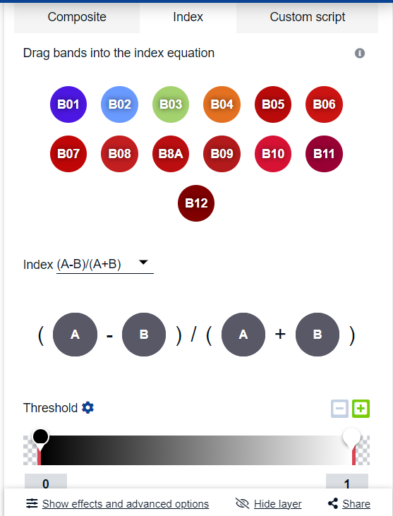 2.这些提供的组合不满意也可以在末尾选择**【Custom】,点击之后可以自行选择波段和指数,也可以通过【Custom script】**自行修改完成更多的显示